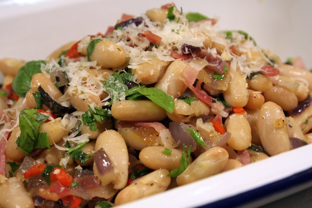 The flavours in this warm salad – garlic, basil, onion, proscuitto and a kiss of chilli are absolute winners with the creamy cannelini beans. With some simply grilled meat, a fresh green salad and jacket potatoes, you have a complete meal that’s delicious, healthy, and has a wonderful mix of contrasting textures and flavours.