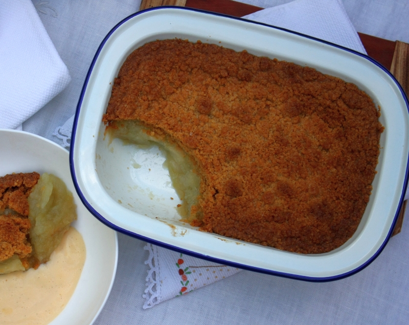 Simple food does not always mean quick to prepare, cook and serve. Simple food for me, is a celebration of natural flavours, seasonal produce, a lack of artifice and loads of love. This apple crumble takes some time to prepare – the apples are peeled, cored and sliced by hand before gently stewing – but the result is worth the time it takes. Granny Smith apples are the best choice with their tartness a real asset when made into a crumble, with its crunchy, sweet topping. There are most likely hundreds of crumble recipes, but this one is our family’s favourite. No rolled oats, no cinnamon, no almonds; just butter, flour, brown sugar and vanilla. With autumn weather bringing cool, crisp mornings, and the daylight hours shortening, the season for warm puddings is at hand. There would be a riot at our place if apple crumble was not accompanied by custard, but it’s also great with just a bit of cream or vanilla ice cream.