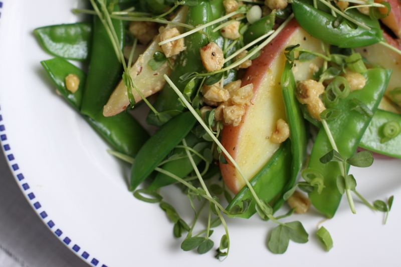 This salad is not much like the mayonnaise flooded, stodgy version of potato salad familiar to many. It has a nutty hazelnut and mustard dressing that has a great bite and contrasts with tender potatoes and crunchy peas. It’s perfect for when sugar snap and snow peas are in season. It can be served warm, or at room temperature. At our place this goes with a pan fried salmon steak or grilled chicken and a glass of pinot gris.