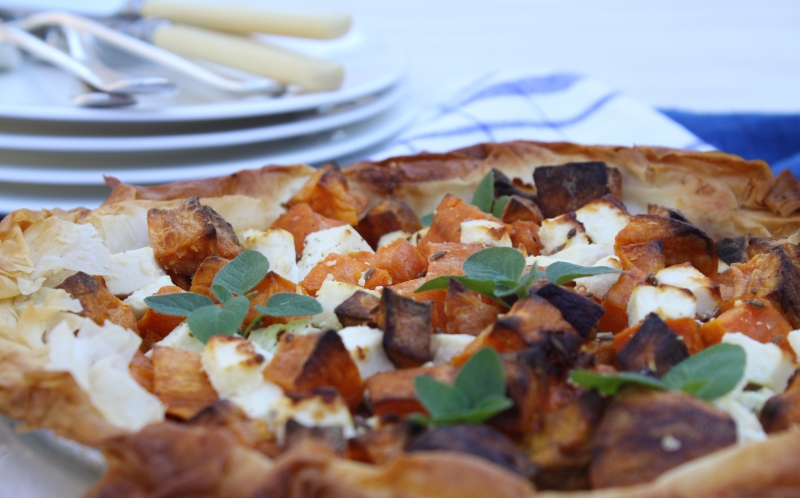 Preheat oven to 180C. Toss the sweet potato in the olive oil so that all the pieces are lightly coated. Roast the sweet potato in a single layer on an oven tray lined with silicon paper until tender and lightly golden. In a medium sized bowl combine the roasted sweet potato, cumin seeds and feta cheese and season well with salt and pepper. Brush the inside of a 20cm in diameter pie dish with a little of the melted butter. Working quickly, brush each layer of filo pastry with the melted butter and line the pie dish. It doesn’t matter if the edges are a little rough – it’s meant to be rustic looking. Spoon in the sweet potato and feta mixture and then return to the oven for 15 minutes, until the pastry is brown and crispy. Serve hot or warm, with the oregano scattered over the top of the pie.