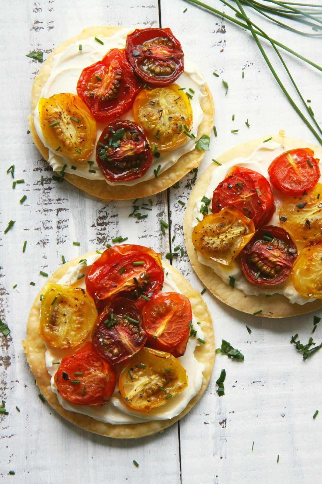 Cooking is so different in the winter; the seasonal ingredients respond to long, slow cooking and have a richness that warms from the inside. I love creating recipes with winter fruits, vegetables and spices, making casseroles, pies, and tasty puddings. But before I let go of light, summery food I wanted to make these delicious roasted cherry tomato tarts – a last taste of summer for me, and perhaps, a first taste of spring for my friends. They would be perfect for a springtime picnic, and they are still delicious in my world, to show off the last of the summer’s tomatoes. I hope you enjoy with a salad of soft herbs and peppery rocket.