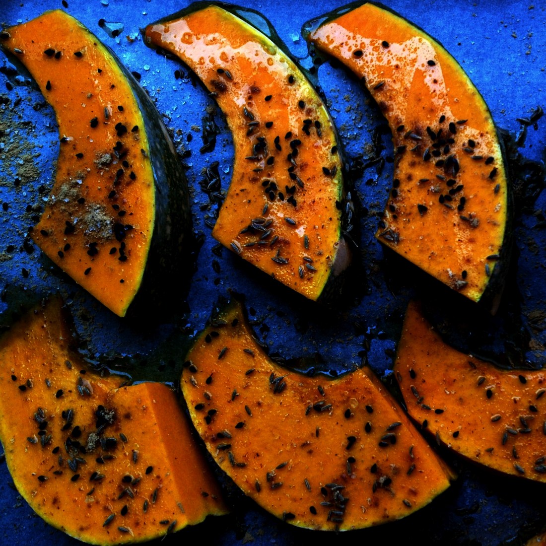 Preheat oven to 180 C. Slice the pumpkin into medium sized wedges, leaving the skin on, but scraping out the seeds and membrane. Place a sheet of silicon paper onto a baking tray and arrange the pumpkin in a single layer on the tray. Drizzle over the olive oil and then evenly scatter over the spices, turning once to cover both sides. Season well with the salt and pepper and roast for 35 – 40 minutes. Remove from the oven and eat hot, or warm in a robust salad.