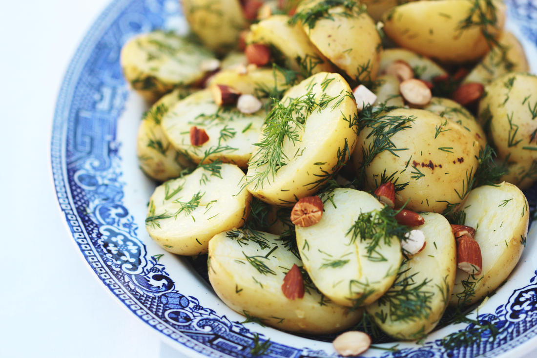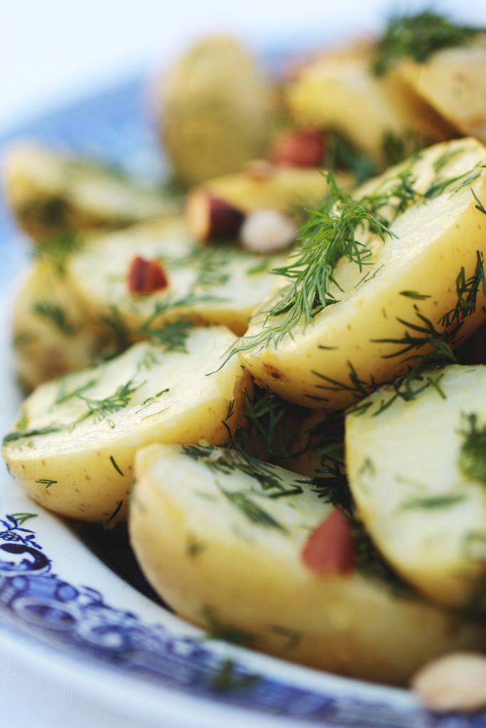 It’s a lighter and fresher tasting potato salad – no heavy mayonnaise dressing to overwhelm the delicate potatoes – just a simple dressing to bring the ingredients together. The almonds provide a satisfying textural contrast, and the dill is heady and herbaceous. It takes only about 20 minutes to make and is a great addition to almost any summertime meal.