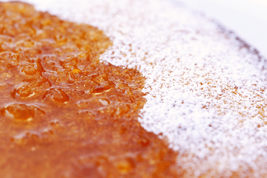 When ready to serve, dust one half of the cake with icing sugar. Two choices now – serve the cake and pass the syrup around for people to pour on their own slice, or dramatically pour the syrup over the whole cake at the table and then serve individual slices…. I’m firmly in the pour-over-the-cake-then-serve camp.
